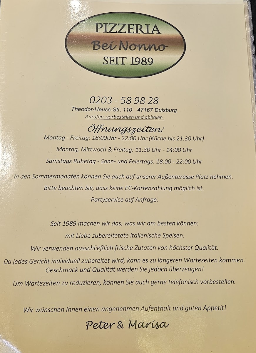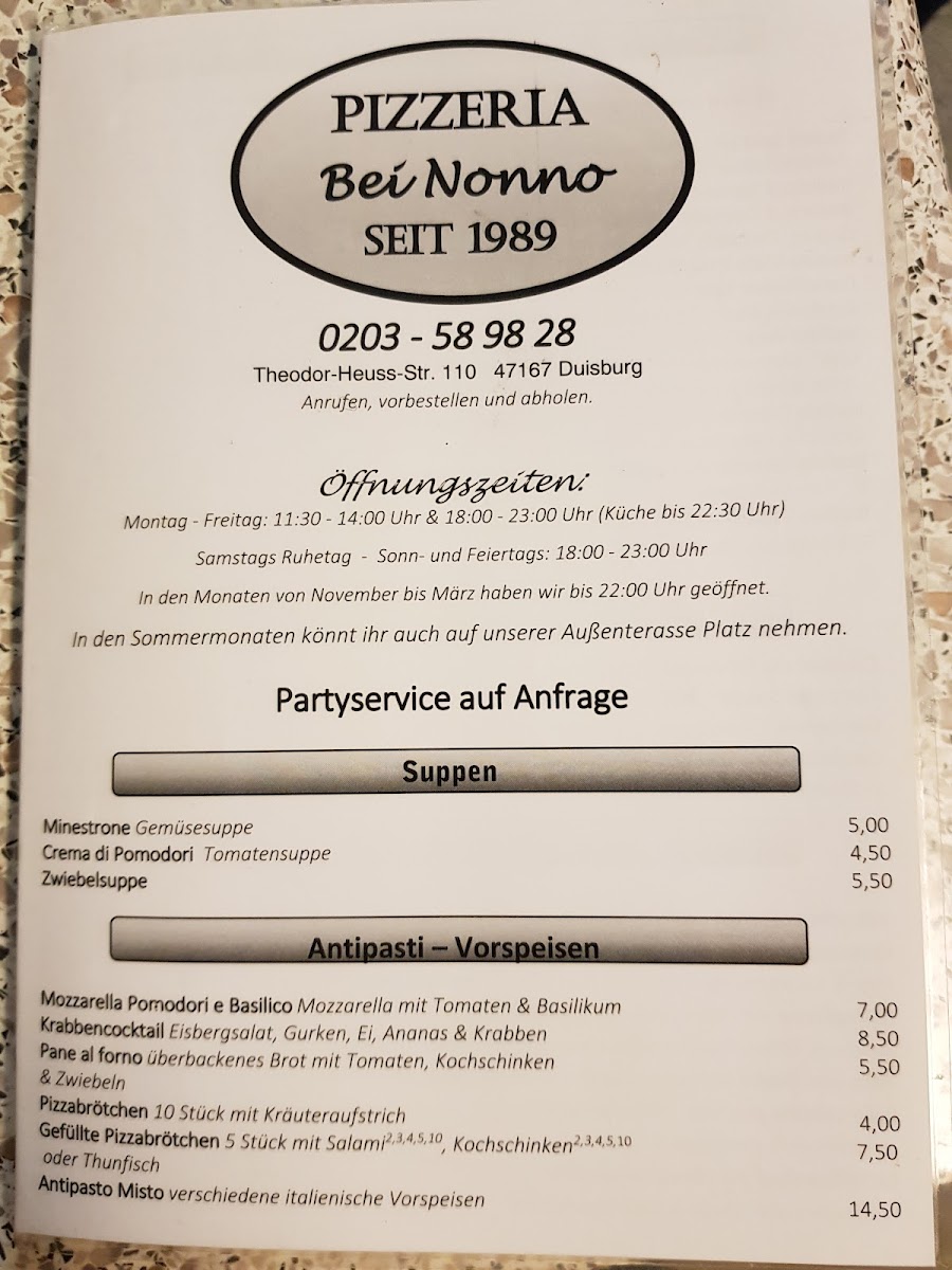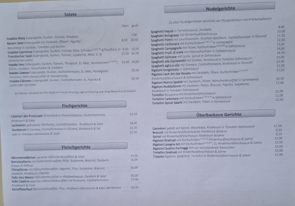 In conclusion, the menu at Bei Nonno - Italienische Spezialitäten offers a satisfying selection of classic Italian comfort dishes that balance hearty flavors with familiar favorites. From well-prepared pasta to generously topped pizzas, the restaurant focuses on traditional combinations that appeal to a wide range of tastes. Standout items include the Pizza Spinat Und Thunfisch, which combines spinach and tuna for a savory, slightly salty flavor profile, and the Pizza Mit Ei Paprika Und Thunfisch, a richer option with egg and paprika adding extra depth. For those who prefer baked dishes, the Überbackener Brokkoli Mit Hackfleischsahnesoße is a filling choice, featuring broccoli in a creamy minced meat sauce baked until golden. Seafood lovers will appreciate the Spaghetti Gamberetti, a classic pasta dish with shrimp that delivers a lighter yet flavorful option. Overall, the menu reflects a traditional Italian approach with generous portions, comforting ingredients, and a variety of choices that make the restaurant a reliable spot for classic Italian specialties.