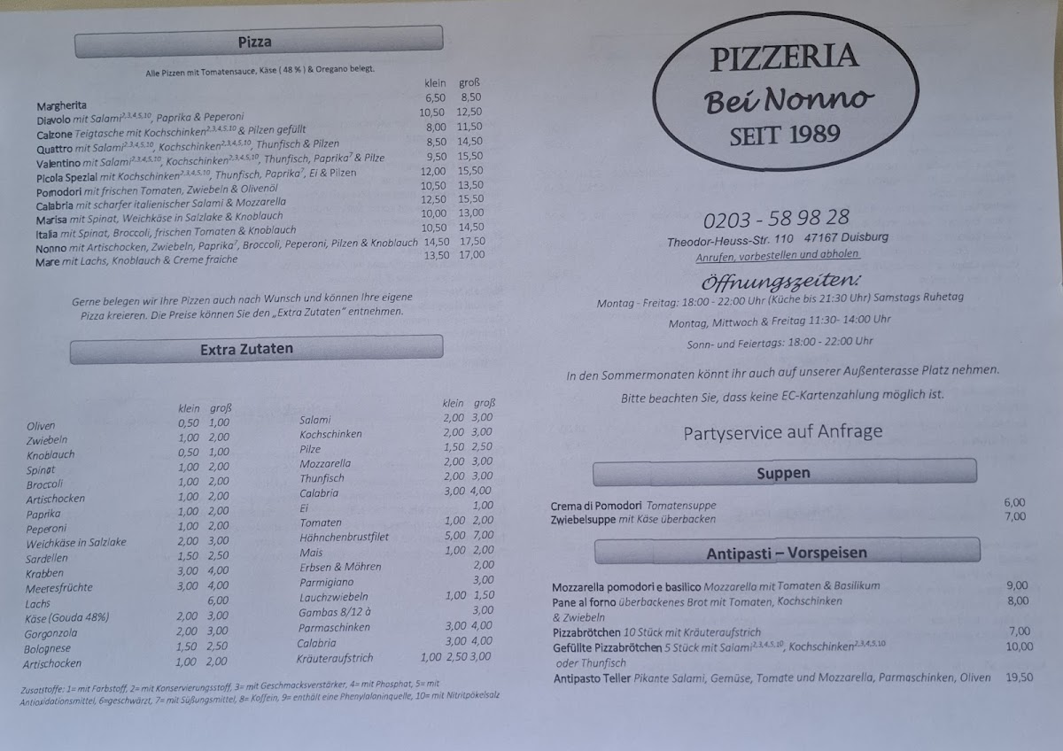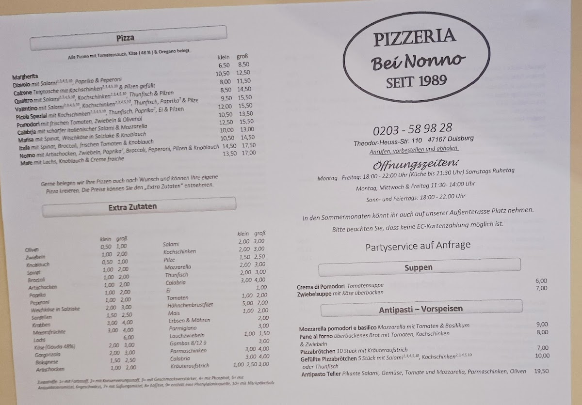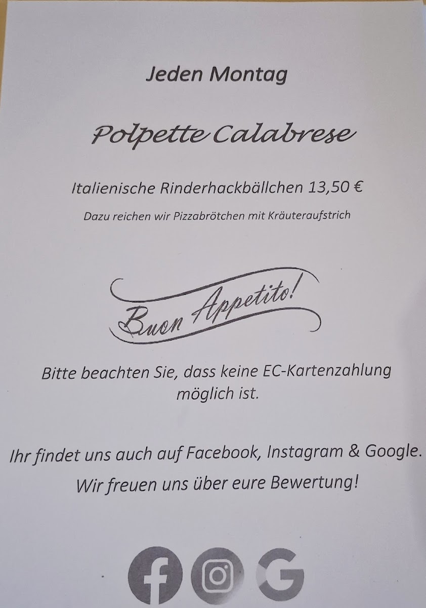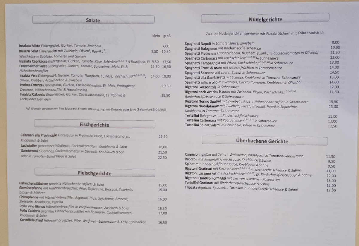 In conclusion, the menu at Bei Nonno - Italienische Spezialitäten offers a satisfying selection of classic Italian comfort dishes that balance hearty flavors with familiar favorites. From well-prepared pasta to generously topped pizzas, the restaurant focuses on traditional combinations that appeal to a wide range of tastes. Standout items include the Pizza Spinat Und Thunfisch, which combines spinach and tuna for a savory, slightly salty flavor profile, and the Pizza Mit Ei Paprika Und Thunfisch, a richer option with egg and paprika adding extra depth. For those who prefer baked dishes, the Überbackener Brokkoli Mit Hackfleischsahnesoße is a filling choice, featuring broccoli in a creamy minced meat sauce baked until golden. Seafood lovers will appreciate the Spaghetti Gamberetti, a classic pasta dish with shrimp that delivers a lighter yet flavorful option. Overall, the menu reflects a traditional Italian approach with generous portions, comforting ingredients, and a variety of choices that make the restaurant a reliable spot for classic Italian specialties.